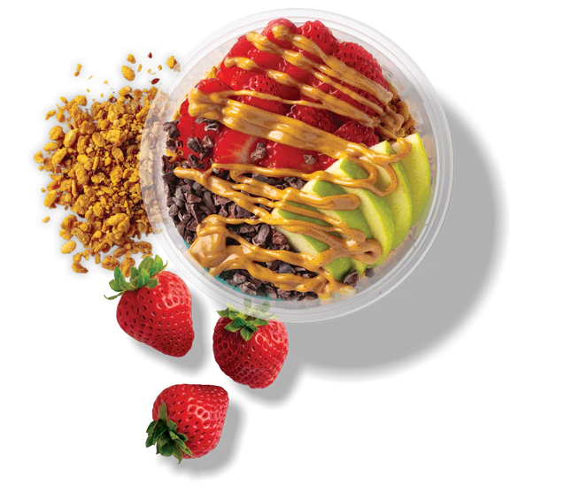 Välj sedan tre valfria toppings – från frukt och bär till krispiga tillbehör, superfoods, såser och skopor.